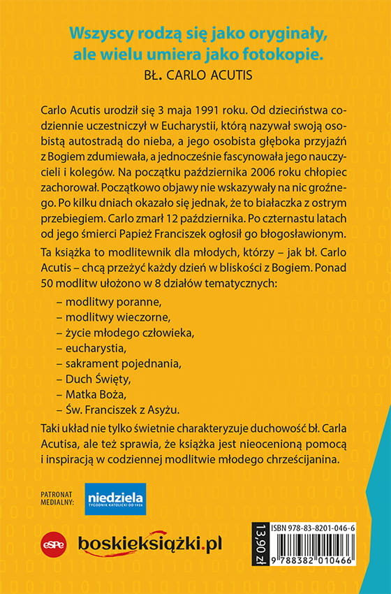 Carlo Acutis urodził się 3 maja 1991 roku. Od dzieciństwa codziennie uczestniczył w Eucharystii, którą nazywał swoją osobistą autostradą do nieba, a jego osobista głęboka przyjaźń z Bogiem zdumiewała, a jednocześnie fascynowała jego nauczycieli i kolegów. Na początku października 2006 roku chłopiec zachorował. Początkowo objawy nie wskazywały na nic groźnego. Po kilku dniach okazało się jednak, że to białaczka z ostrym przebiegiem. Carlo zmarł 12 października. Po czternastu latach od jego śmierci Papież Franciszek ogłosił go błogosławionym. Ta książka to modlitewnik dla młodych, którzy jak - bł. Carlo Acutis - chcą przeżyć każdy dzień w bliskości z Bogiem. Ponad 50 modlitw ułożono w 8 działów tematycznych: -modlitwy poranne, -modlitwy wieczorne, -życie młodego człowieka, -eucharystia, -sakrament pojednania, -Duch Święty, -Matka Boża, -Św. Franciszek z Asyżu. Taki układ nie tylko świetnie charakteryzuje duchowość bł. Carla Acutisa, ale też sprawia, że książka jest nieocenioną pomocą i inspiracją w codziennej modlitwie młodego chrześcijanina.