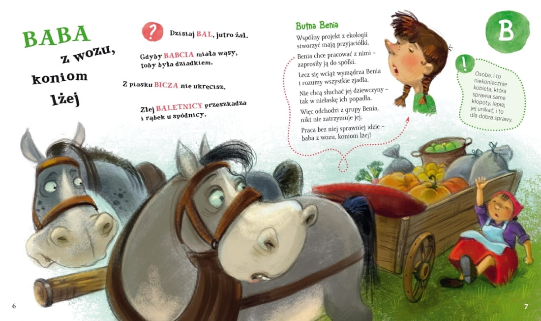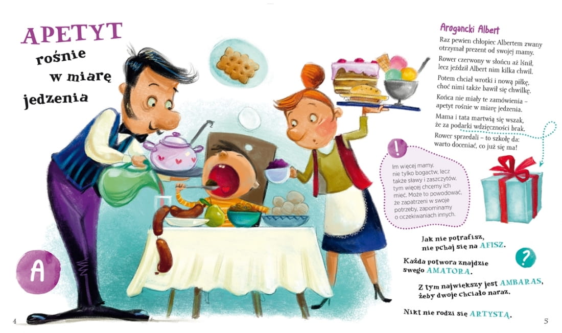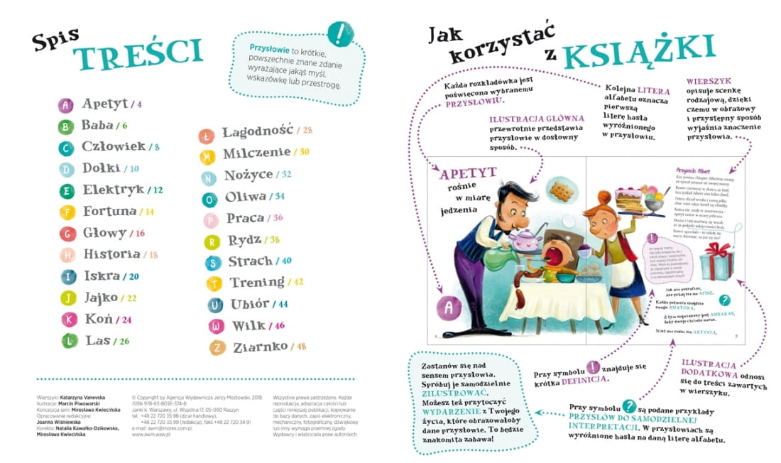 KULTOWE PRZYSŁOWIA są tu dowcipnie zilustrowane. BŁYSKOTLIWE WIERSZYKI nawiązują do znanych dzieciom codziennych wydarzeń i oddają sens przysłów. PROSTE DEFINICJE przysłów są zrozumiałe dla młodego czytelnika. Ta PIĘKNIE i NIEBANALNIE zilustrowana książka stanowi DOBRY WSTĘP do zainteresowania dziecka przysłowiami, których często i chętnie używamy. Są w końcu „mądrością narodów”! Każda rozkładówka jest poświęcona JEDNEMU PRZYSŁOWIU, w którym wyróżnione hasło zaczyna się na kolejną literę alfabetu. ILUSTRACJA przedstawia przysłowie w dosłowny, a przez to zabawny sposób. WIERSZYK wyjaśnia ZNACZENIE PRZYSŁOWIA, przedstawiając je w formie scenki rodzajowej z życia dzieci. Jest wzbogacony rysunkiem związanym z nim tematycznie. Żeby przekonać się, czy dziecko poprawnie odgadło znaczenie przysłowia, warto przeczytać też KRÓTKĄ DEFINICJĘ. To nie koniec zabawy – do własnej kreatywności i odkrywania sensu inspirują PRZYKŁADY PRZYSŁÓW DO SAMODZIELNEJ INTERPRETACJI.