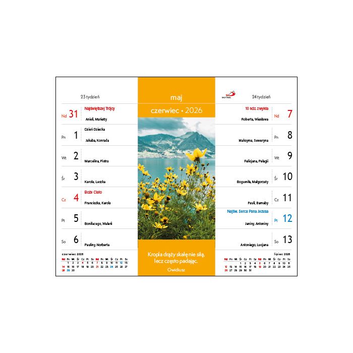 Poręczny kalendarz na biurko Szukasz niewielkiego kalendarza na biurko? Wybierz kalendarz „Wszystko ma swój czas”, który przypomina, za Koheletem, że w życiu jest pora na wszystko i czas na każdą sprawę. Bogate wnętrze W kalendarzu zamieszczono: dwa tygodnie na jednej stronie, kolorowe zdjęcia, cytaty, imieniny i święta, miejsce na notatki, skrócone kalendarium miesiąca bieżącego i kolejnego na każdej stronie, skrócony kalendarz na rok 2026 na końcu. Inspirujące cytaty Kalendarz wyróżniają inspirujące i pełne nadziei cytaty mówiące o naszym życiu: o kroplach radości, o miłości Boga i ludzi, o przebaczeniu, czasie, opiece Maryi… To piękne słowa, które pomogą Ci lepiej przeżyć każdy dzień 2026 roku.