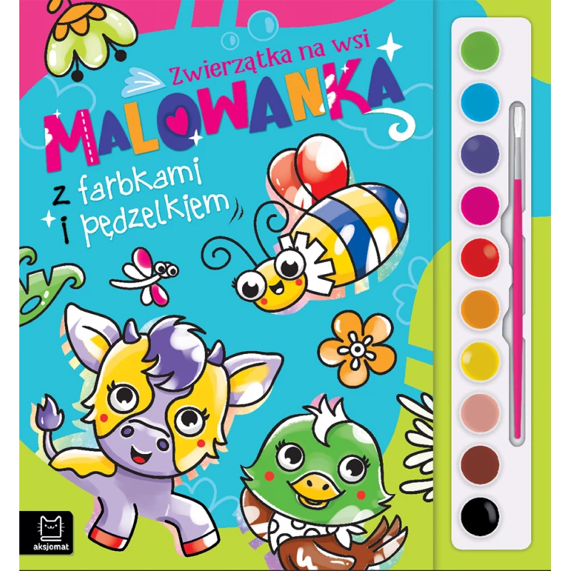 Piękne obrazki, pędzelek i zestaw farbek to propozycja dla małych artystów. Zapraszamy na spotkanie z mieszkańcami wsi – poznaj każdego z nich z osobna. Są tu: świnka, szybki kucyk Karino, kogut Czester, owieczka Beza, indyczka Izaura, króliczek Flopcio, kurka Hilda, myszka Śmieszka, krówka Blenda, żabki Alma i Wera, ślimak Lucjan, Biedronka Fionka i mały ptaszek. Który zwierzak chce się bawić w chowanego? Który złości się i rozkłada ogon? Czy Śmieszka znajdzie krecika Dyzia? Lubiana przez dzieci tematyka rysunków i ciekawe historyjki o zwierzętach zachęcą dzieci do kolorowania. Malowanki ze zwierzakami to świetna zabawa kolorami, która rozwinie kreatywność i sprawność manualną dziecka. Pozwoli również ćwiczyć cierpliwość i koncentrację. Dołączony do książeczki zestaw 10 kolorów farbek i pędzelek pozwalają dziecku rozpocząć zabawę gdzie i kiedy chce – wystarczy tylko odrobina wody. Baw się kolorami razem ze zwierzętami! Malowanka z farbkami i pędzelkiem to strzał w dziesiątkę!