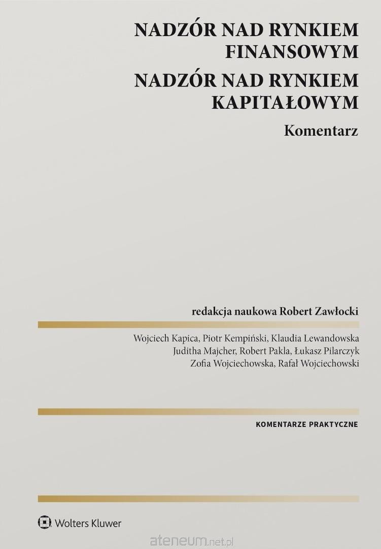 Komentarz jest kompleksowym opracowaniem najważniejszych przepisów związanych z nadzorem nad rynkiem finansowym w Polsce. Obejmuje on dwa akty prawne, wzajemnie się przenikające i uzupełniające: ustawę o nadzorze nad rynkiem finansowym oraz ustawę o nadzorze nad rynkiem kapitałowym, których najważniejszą funkcją jest normatywne określenie uprawnień i procedur przysługujących organom nadzoru. Autorzy - osoby o bogatym dorobku naukowym oraz praktyce w swojej dziedzinie - szczególną uwagę poświęcili zagadnieniom funkcji i zadań Komisji Nadzoru Finansowego w systemie prawa, procedurom jej działania w zakresie nadzoru nad instytucjami finansowymi oraz jej szczególnej roli w zapewnieniu bezpieczeństwa nad rynkiem finansowym. Niezależnie od analizy podstawowych, ustrojowych przepisów, omówili także procedury związane z postępowaniem wyjaśniającym, postępowaniem układowym, wpisem na listę ostrzeżeń publicznych oraz dotyczące sfery sankcyjnej. W opracowaniu wskazano na szereg problemów praktycznych w stosowaniu przepisów, odwołując się do aktualnego orzecznictwa oraz poglądów doktryny. Uwzględniono najnowszy stan prawny, m.in. nowelizacje ustaw dokonane: ustawą z 16.08.2023 r. o zmianie niektórych ustaw w związku z zapewnieniem rozwoju rynku finansowego oraz ochrony inwestorów na tym rynku (Dz.U. poz. 1723), a także ustawą z 20.12.2024 r. o podmiotach obsługujących kredyty i nabywcach kredytów (Dz.U. z 2025 r. poz. 146).