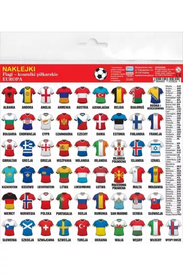 Zestaw samoprzylepnych naklejek z koszulkami piłkarskimi w barwach narodowych reprezentacji to świetny pomysł na kreatywną zabawę. Zawiera koszulki z flagami 55 reprezentacji należących do europejskiej konfederacji piłkarskiej. Doskonale sprawdzi się do ozdabiania kartek okolicznościowych, prezentów, notesów, zeszytów czy pudełek. Idealny dla małych fanów piłki nożnej! Format: 190 x 194 mm