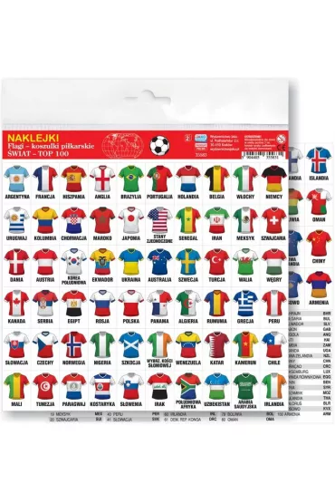 Zestaw samoprzylepnych naklejek z koszulkami piłkarskimi w barwach narodowych reprezentacji to świetny pomysł na kreatywną zabawę. Zawiera koszulki z flagami 100 najlepszych reprezentacji świata. Doskonale sprawdzi się do ozdabiania kartek okolicznościowych, prezentów, notesów, zeszytów czy pudełek. Idealny dla małych fanów piłki nożnej! Format: 190 x 194 mm Ilość arkuszy: 2