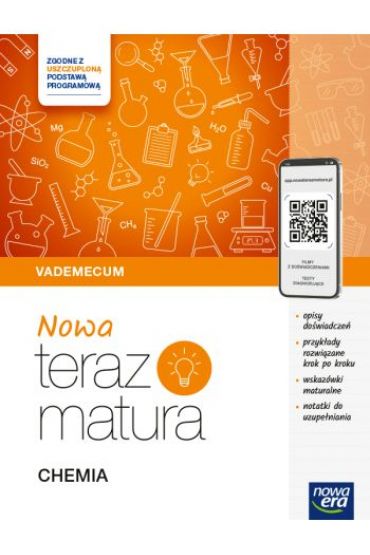 Vademecum „NOWA Teraz matura. Chemia” pozwala uporządkować i powtórzyć treści przed egzaminem. Jest w pełni skorelowane ze Zbiorem zadań maturalnych „NOWA Teraz matura. Chemia. Część 1. i 2.” i zawiera kody dostępu do dodatkowych materiałów na app.nowaterazmatura.pl. Zgodne uszczuploną podstawą programową. Planer – pomoc w zaplanowaniu powtórek opisy Doświadczeń chemicznych przedstawiającymi krok po kroku ich przebieg Przykłady – wyjaśniają krok po kroku rozwiązania wielu typów zadań, w tym zadań CKE Na to zwróć uwagę! – kierują uwagę na kwestie ważne na maturze Dokończ notatkę – podsumowuje i porządkuje wiedzę marginesy – umożliwiają dodawanie własnych notatek podsumowanie ważnych treści egzaminacyjnych w dziale Kluczowe umiejętności sprawdzane na egzaminie dodatkowe materiały, m.in. filmy z doświadczeń, testy diagnozujące, fiszki, animacje, dostępne na app.nowaterazmatura.pl NOWA Teraz matura. I wiesz, jak zdać nową maturę. Dostęp do zasobów cyfrowych jest możliwy po rejestracji w aplikacji app.nowaterazmatura.pl i aktywacji kodu dostępu z publikacji. Kod umożliwia dostęp do materiałów od 1 września do 31 sierpnia następnego roku, niezależnie od dnia aktywacji.