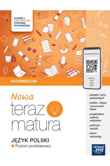 Vademecum „NOWA Teraz matura. Język polski” pozwala powtórzyć treści przedmiotowe oraz zapoznać się ze sposobami rozwiązywania zadań egzaminacyjnych. Zgodne z uszczuploną podstawą programową. komplet wymaganej teorii i wiedzy o lekturach w jednym miejscu dostęp do materiałów cyfrowych, m.in.: quizów i animacji do lektur, fiszek i filmów utrwalających wiedzę o epokach graficzne notatki do uzupełniania krótkie streszczenia lektur w vademecum i obszerne, szczegółowe streszczenia w aplikacji zadania maturalne po każdym dziale planer – plan przygotowań do matury NOWA Teraz matura. I wiesz, jak zdać maturę. Dostęp do zasobów cyfrowych jest możliwy po rejestracji w aplikacji app.nowaterazmatura.pl i aktywacji kodu dostępu z publikacji. Kod umożliwia dostęp do materiałów od 1 września do 31 sierpnia następnego roku, niezależnie od dnia aktywacji.