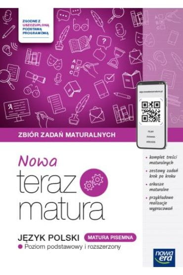 Zbiór zadań do matury pisemnej „NOWA Teraz matura. Język polski. Do matury 2025” z dostępem do materiałów cyfrowych umożliwia ćwiczenie rozwiązywania różnego typu zadań maturalnych i pracę z arkuszami. Zgodne z uszczuploną podstawą programową. kompletna baza ćwiczeniowa przykładowe realizacje zadań ze wskazówkami arkusze maturalne z odpowiedziami interaktywny katalog motywów literackich i kulturowych tutoriale video dodatkowe arkusze maturalne NOWA Teraz matura. I wiesz, jak zdać maturę. Dostęp do zasobów cyfrowych jest możliwy po rejestracji w aplikacji app.nowaterazmatura.pl i aktywacji kodu dostępu z publikacji. Kod umożliwia dostęp do materiałów od 1 września do 31 sierpnia następnego roku, niezależnie od dnia aktywacji.