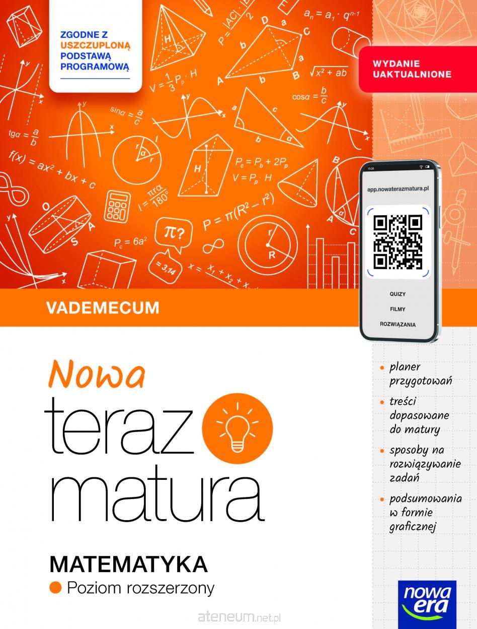 To uaktualnione vademecum z serii NOWA Teraz matura będzie przydatne dla wszystkich uczniów przygotowujących się do matury z matematyki na poziomie rozszerzonym. Pomoże skutecznie uporządkować wiedzę, przećwiczyć różne typy zadań i przygotować się do egzaminu z matematyki 2026 zgodnie z najnowszymi wymaganiami CKE i uszczuploną podstawą programową. Co znajdziesz w środku? Sprawdzony układ publikacji: planer - optymalny harmonogram powtórek całego materiału wiadomości teoretyczne dopasowane do wymagań egzaminacyjnych w każdym temacie kluczowe zadania z rozwiązaniami krok po kroku zadania analogiczne do samodzielnego treningu graficzne podsumowania działów - ułatwiające zapamiętywanie najważniejszych własności i wzorów sekcje zadań maturalnych pozwalające na sprawdzenie się w biegłości rozwiązywania zadań egzaminacyjnych z poszczególnych działów odpowiedzi do wszystkich zadań miejsce na marginesie na własne notatki kody QR prowadzące m.in. do: quizów, plików PDF z rozwiązaniami WSZYSTKICH zadań, filmów do zadań z podsumowań Uaktualnienia do matury 2026: zaktualizowane zadania CKE zgodnie z najnowszym Informatorem, część zadań CKE wymieniona na nowsze nowe filmy w wybranych podsumowaniach Dostęp do materiałów cyfrowych: rozwiązania wszystkich zadań uzupełnione podsumowania filmy do zadań z podsumowań quizy z teorii