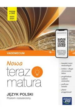 Vademecum z cyfrowym wspomaganiem nauki "NOWA Teraz matura. Język polski" zostało przygotowane z myślą o przyszłych maturzystach, którym ma ono ułatwić powtórzenie i przypomnienie wiadomości z języka polskiego. Praca spełnia wymagania egzaminacyjne stawiane przez Centralną Komisję Egzaminacyjną, które będą obowiązywać na nowej maturze z języka polskiego w zakresie rozszerzonym w latach 2023-2024. Na samym początku uczeń zostanie zaskoczony przez rozpisany plan powtórzeń, który pozwoli świetnie i bez zbędnego stresu przygotować się do egzaminu dojrzałości. W vademecum została zebrana cenna wiedza na temat lektur oraz wszelkiej teorii, którą zobowiązany jest znać maturzysta. Dodatkowo autorzy przygotowali dostęp do różnego rodzaju materiałów cyfrowych takich jak quizy, filmy o poszczególnych epokach literackich, fiszki oraz animacje dotyczące lektur. Materiały cyfrowe mają również za zadanie poszerzenie wiedzy zawartej w samym vademecum np. o obszerniejsze i bardziej szczegółowe streszczenia lektur. Publikacja “NOWA Teraz matura. Język polski. Zakres rozszerzony. Vademecum z cyfrowym wspomaganiem nauki” obejmuje następujące działy wiedzy: Matura pisemna - jak wygląda, z czego się składa, wypracowania wraz z przykładami ich realizacji; Matura ustna - jak powinna wyglądać, przykłady; Historia literatury; Wiedza o literaturze; Wiedza o kulturze; Nauka o języku. Co najważniejsze, na końcu każdego bloku tematycznego został umieszczony zbiór zadań maturalnych, pozwalających na zapoznanie się z ich specyfiką oraz zrozumienie klucza, za pomocą którego są oceniane