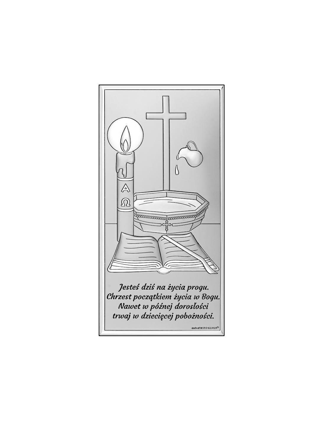 Obrazek pokryty czystym srebrem najwyższej próby 999,95 Spersonalizowaną tabliczkę z grawerem (w cenie produktu!) Ozdobne pudełko prezentowe Certyfikat autentyczności od producenta Beltrami s.r.l. Podpórkę umożliwiającą postawienie obrazka Możliwość zawieszenia na ścianie Opis produktu: Ekskluzywna pamiątka wykonana z najwyższej jakości materiałów – srebrny obrazek przedstawiający motyw chrztu świętego. Całość zamknięta w eleganckiej ramce o wymiarach 7 x 14 cm. Obrazek został zabezpieczony specjalnym lakierem, dzięki czemu pięknie odbija światło i zachowuje trwałość przez wiele lat. Technologia wykonania: Srebro czystej próby 999,95 na opatentowanym podkładzie MIRO-SILVER Wzmocnienie aluminiowe ALANOD od spodu Tył z wysokiej jakości drewna Dodatkowa warstwa ochronna zapobiegająca matowieniu i zarysowaniom Dodatkowe atuty: Możliwość powieszenia lub postawienia – idealny do pokoju dziecka Praktyczna i elegancka forma – gotowy prezent na wyjątkową okazję Klasyczny styl i włoska jakość wykonania Uwaga: Personalizowany grawer GRATIS! Dodaj osobistą dedykację, która sprawi, że pamiątka będzie unikalna i pełna emocji. Grawer wykonujemy na metalowej tabliczce dopasowanej do rozmiaru obrazka. Do wyboru wersja srebrna (standard) lub złota. Pamiątka z duszą Srebrne obrazki to nie tylko elegancki prezent – to także trwały symbol duchowego przeżycia i piękna pamiątka na całe życie. Idealne jako upominek od rodziców chrzestnych, dziadków czy rodziny.