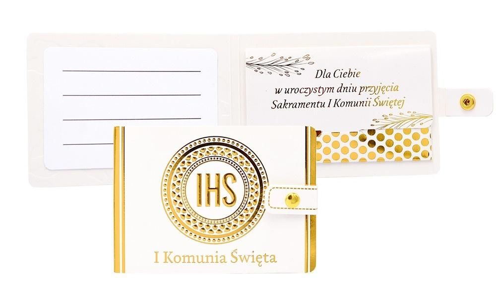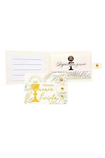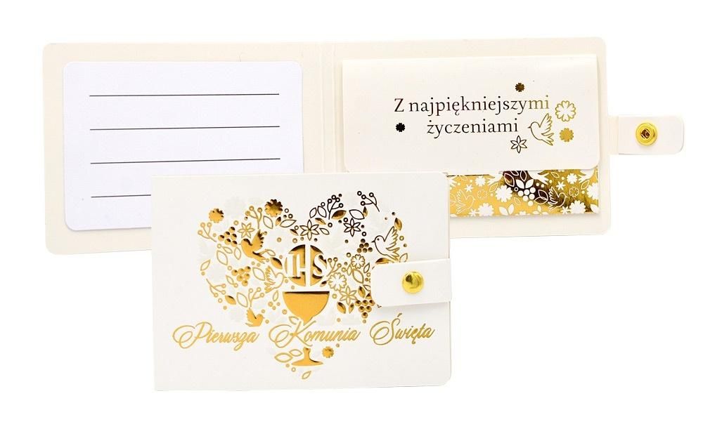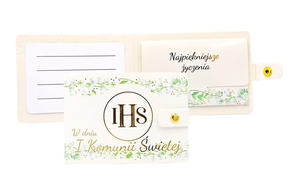 Portfelik POR-028 na I Komunię ŚwiętąPortfeliki z życzeniami to alternatywa dla tradycyjnych kartek, są wyjątkowym sposobem na podarowanie bliskiej osobie banknotu. Portfeliki są kolorowe i uszlachetnione metalizowaną folią hot-stamp, oraz są wyposażone w zamknięcie na zatrzask, co umożliwia ich wielokrotne otwieranie i zamykanie - jak w prawdziwym portfelu. Portfeliki zawierają niebanalne teksty oraz życzenia w ś :wymiary: 11 x 8 cm (po złożeniu)wnętrze: życzenia w środkuwaga: 13 gokazja: Komunia Święta