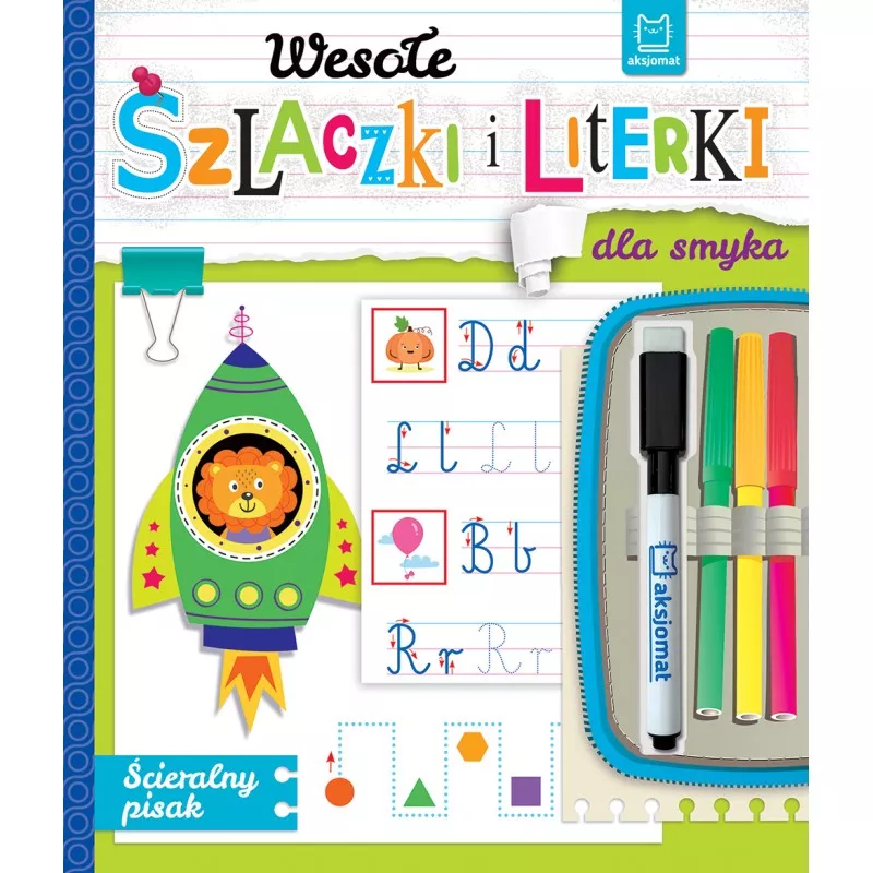 Wesołe szlaczki i literki dla smyka” polecamy do nauki pisania i rysowania szlaczków! • W szerokich liniach dziecko pisze litery oraz krótkie wyrazy. • Rysowanie szlaczków oraz rysunków po liniach to doskonałe ćwiczenia małej rączki. • Dołączony pisak i specjalny papier umożliwiają ścieranie i wielokrotne pisanie. • Zróżnicowane zadania i barwne ilustracje zachęcają dzieci do pracy z książką.