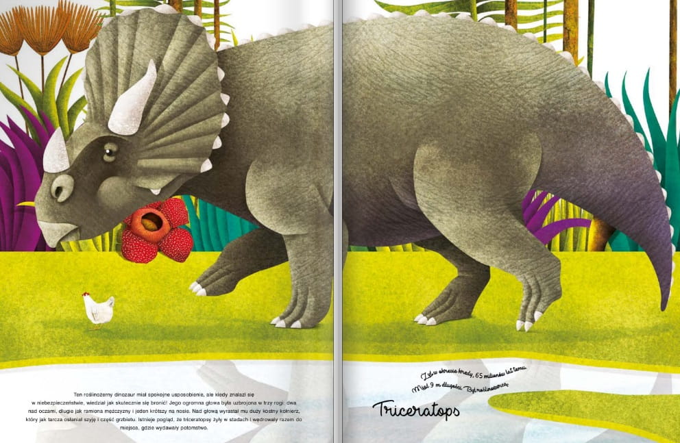 Największe i najmniejsze stworzenia z okresu jurajskiego spotykają się w dwóch książkach. Mała książka dotycząca najmniejszych dinozaurów idealnie pasuje do dużej okładki o największych dinozaurach. Na każdej stronie postać kury służy jako odniesienie do wielkości zarówno małych jak i dużych dinozaurów.
