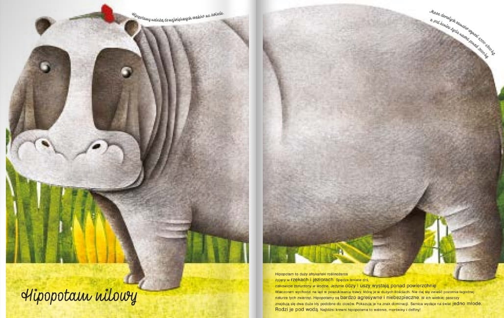 Największe i najmniejsze stworzenia królestwa zwierząt spotykają się w dwóch książkach. Mała księga małych zwierząt idealnie pasuje do wycięcia w dużej okładce wielkiej księgi. Na każdej stronie znajduje się kwiat maku, który pełni funkcję odniesienia do wielkości zarówno małych, jak i dużych zwierząt.